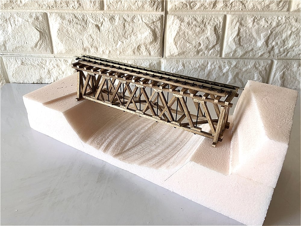 Handcrafted wooden deck-truss bridge inspired by classic Japanese forest railways. Designed under the supervision of a former civil engineer (bridges/dams). Each basswood member is individually milled, stain-dyed, and hand-assembled. Finished product (not a kit). Use it embedded in a layout or as a standalone rolling-stock display. Track is pre-laid with PECO pins and can be removed by pulling the pins (no glue).
